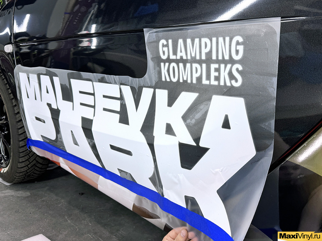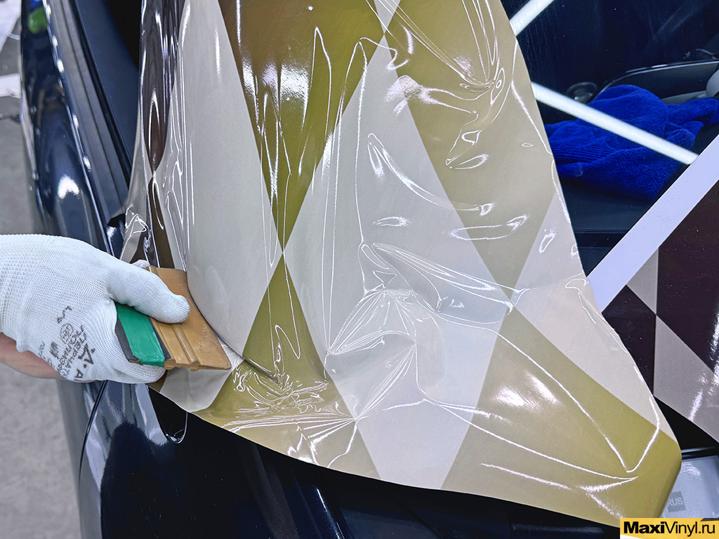 Теперь начинается самое интересное – этап оклейки, основой образа становится премиальная пленка Oracal серии 970, цвет 704G — глубокий чёрный глянец с металлизированными вкраплениями. Этот выбор подчёркивает утончённость и элегантность нашего героя. Специально разработанная винилография украшает задние крылья — символичные чёрно-белые клеточки финишного флага делают машину легко узнаваемой и привлекательной. Печать произвели на пленке Oracal Orajet 3551 с ламинацией Oracal Oraguard 215.