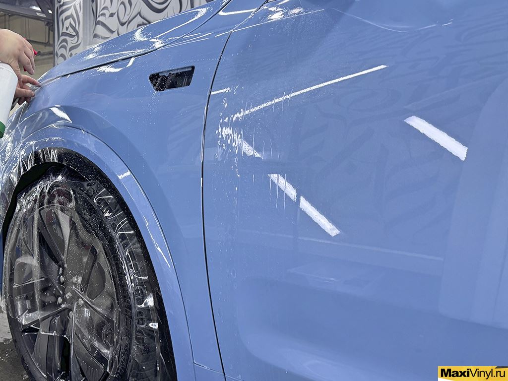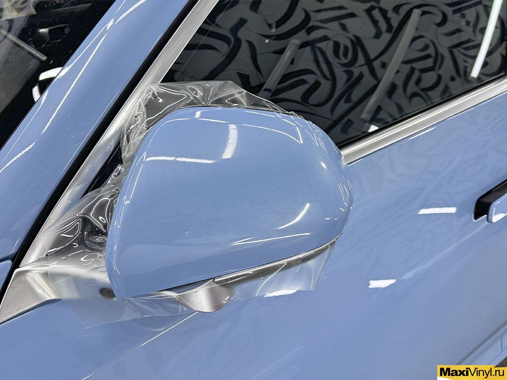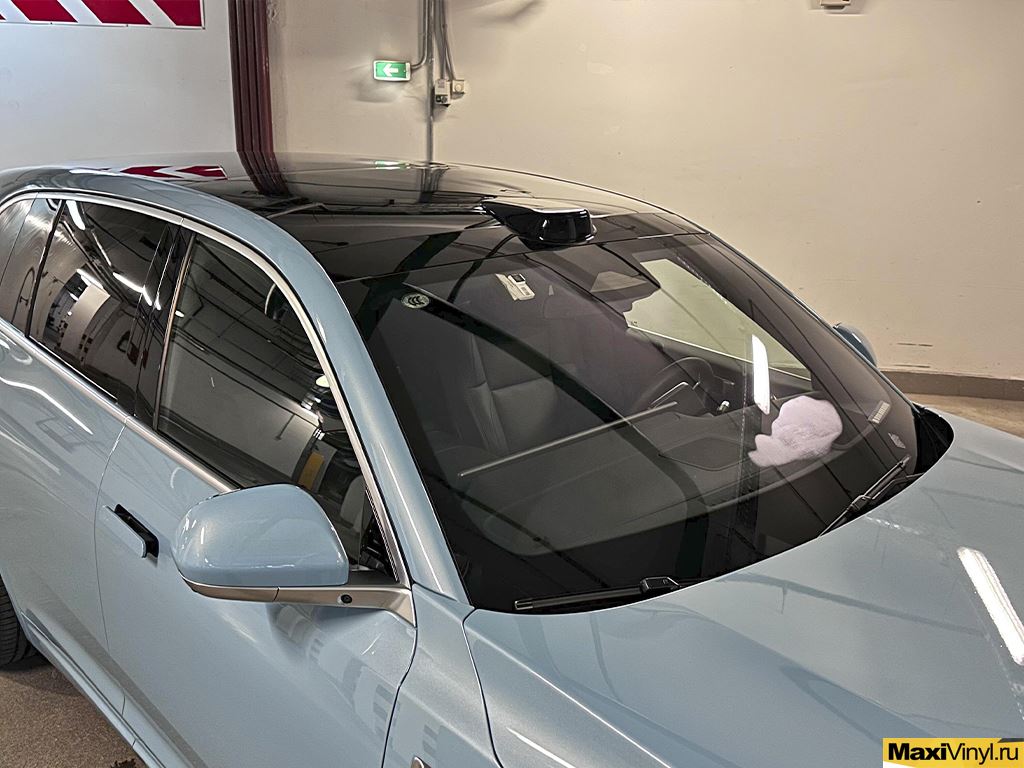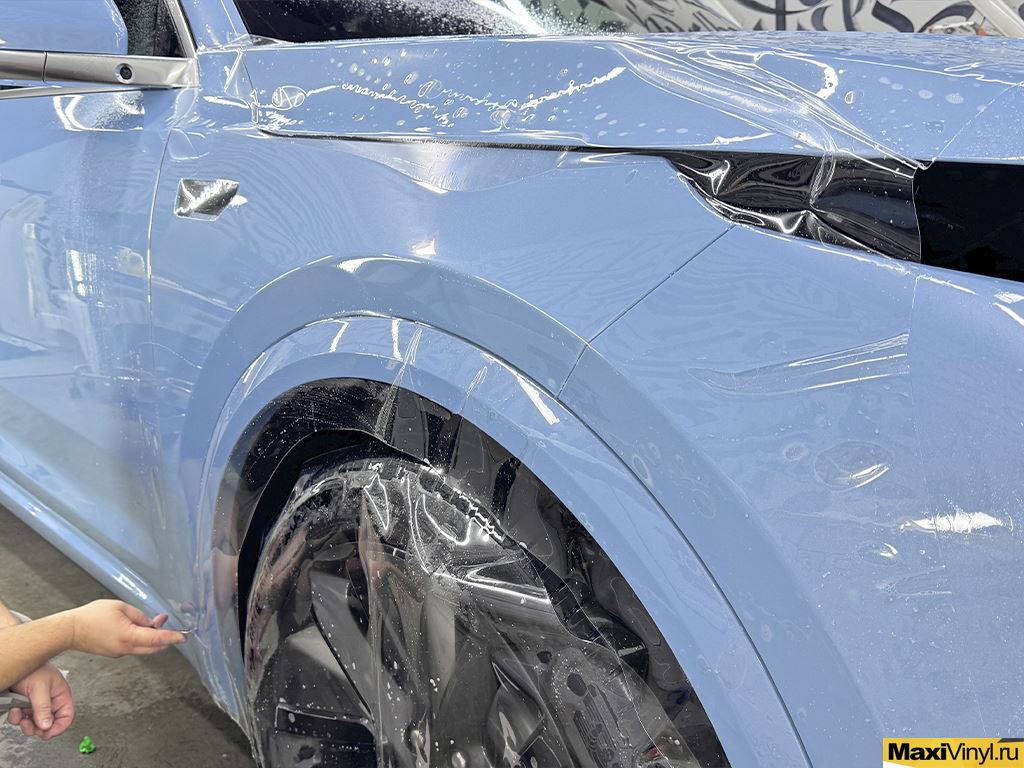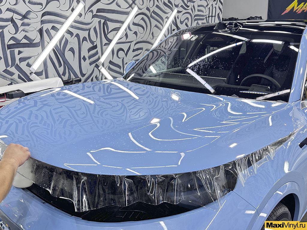 Перед началом работ мы тщательно помыли кузов автомобиля, удалили дорожный битум и подготовили поверхность к оклейке. В оклейку зоны риска входит: капот, передний бампер, фары, зеркала, передние крылья, стойки у лобового стекла и полоса на крыше. Эти детали первыми принимают на себя удары от пескоструя, мелких камней и дорожной химии, поэтому именно они требуют надёжной защиты.